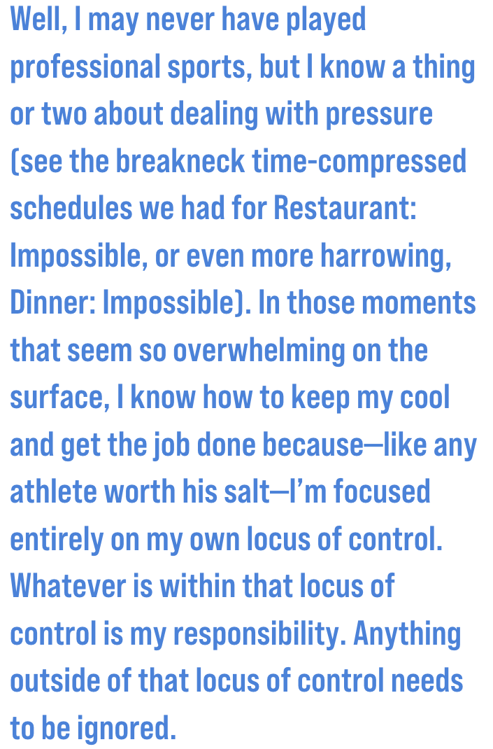 On a busy TV set my locus of control is really just two things: 1) How much I’m helping the effort with my own hands—pitching in with the renovation, demonstrating a cooking technique, etc. and 2) My own behavior towards others, which includes my ability to calmly articulate the mission, delegate responsibilities as necessary, and judge the quality and progress of everything that’s happening. Let me tell you: Number 2 is a whole lot easier to do when I have the humility to acknowledge that everyone else’s behavior is outside of my locus of control. All I can do is stay calm and try to lead by example. After that, people will follow or they won’t. If you’ve chosen the people around you well, then they will follow.